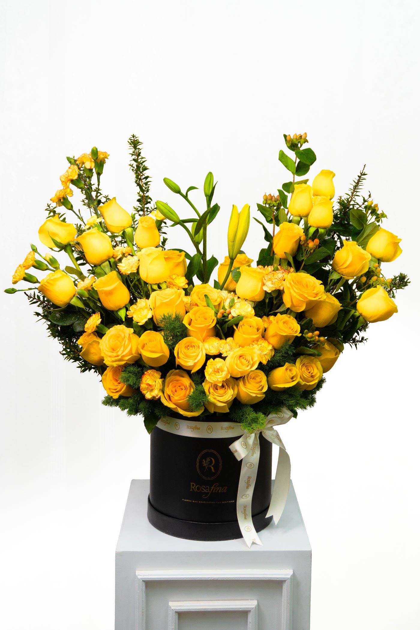 ⟡ Box 20cm + 50 mix de flores ( rosas premium, lilium, claveles ) + follaje de estación.