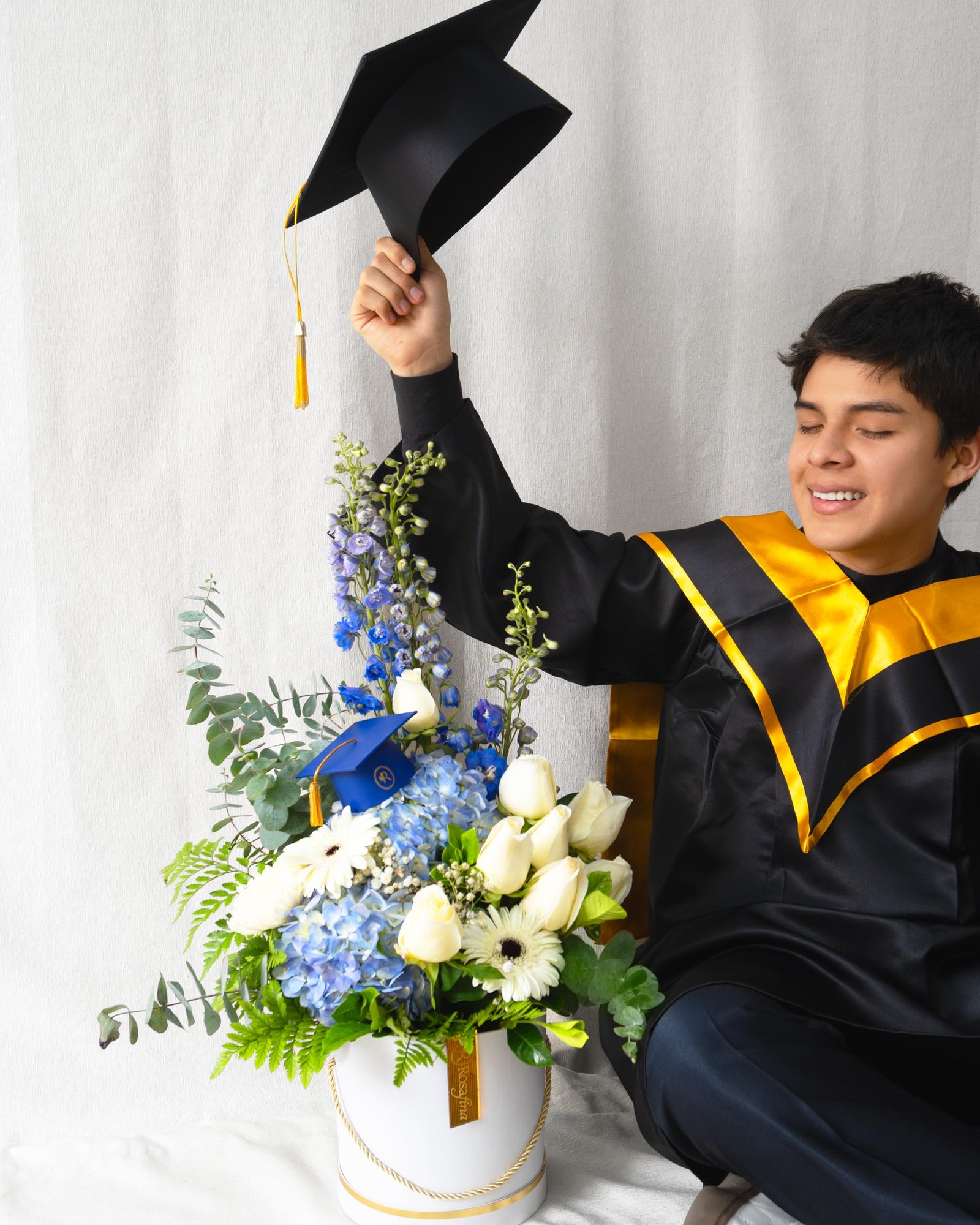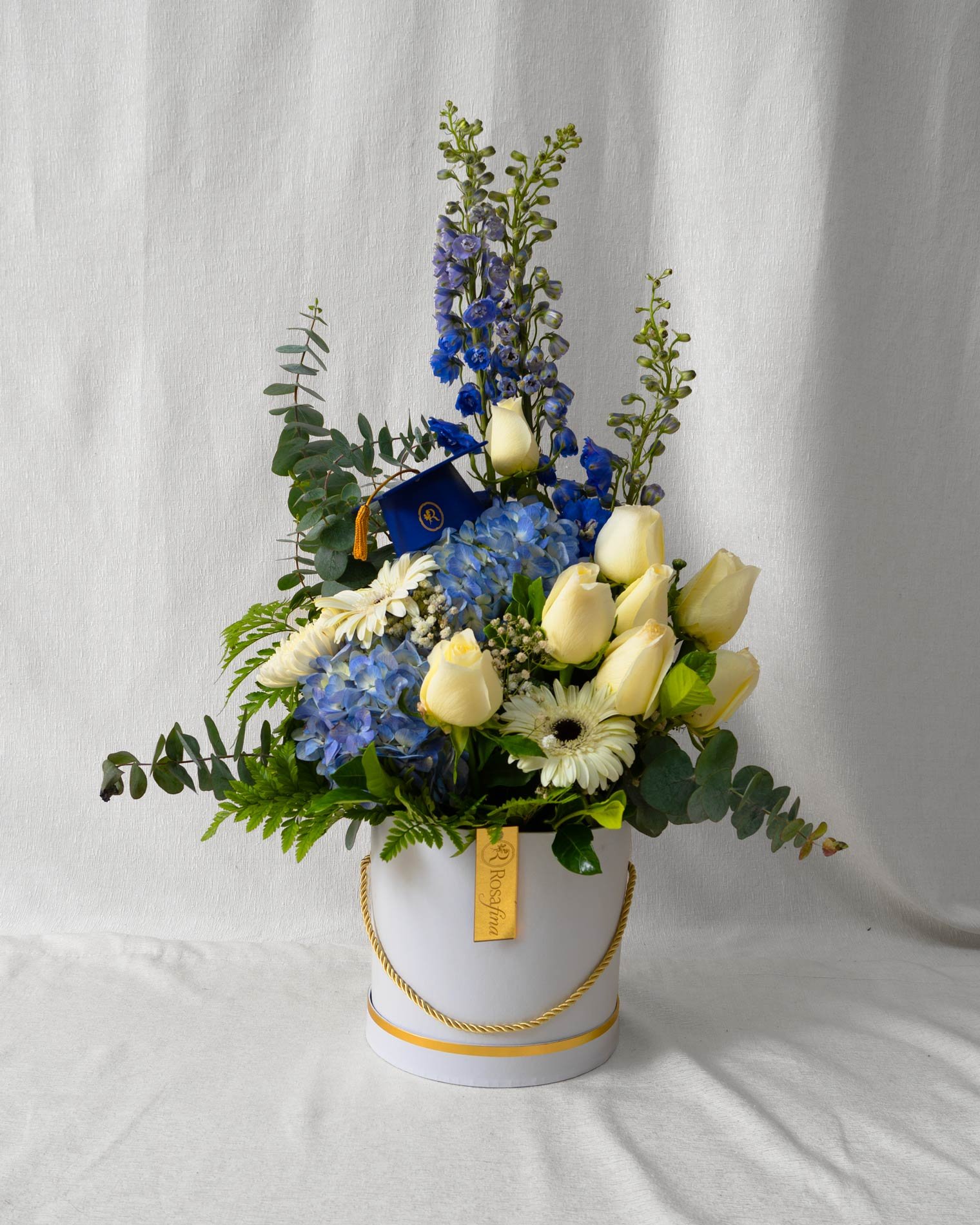 Composición flores premium (hortensias, rosas, gerberas y acentos florales con follaje según estación) acompañado con toga rosafina.