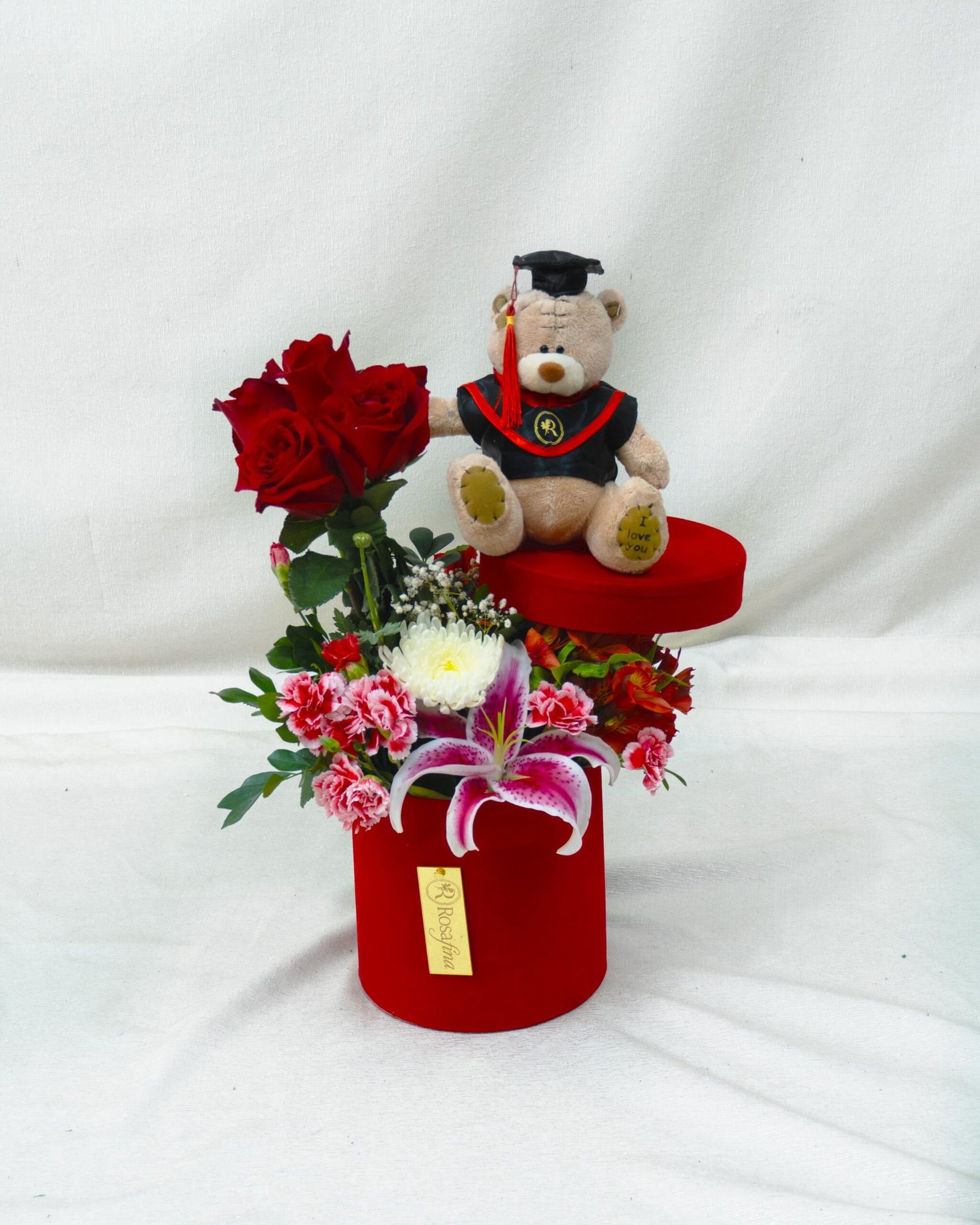 Composición floral (astromelias, lirium, claveles y acentos florales según estación) + peluche Rosafina graduado con caja terciopelo.