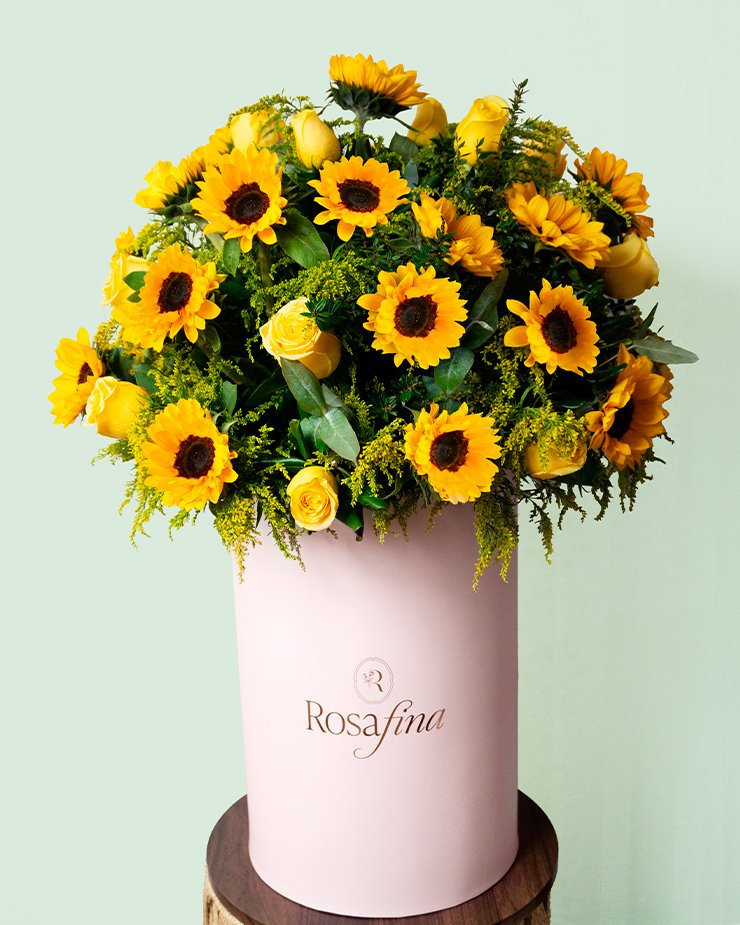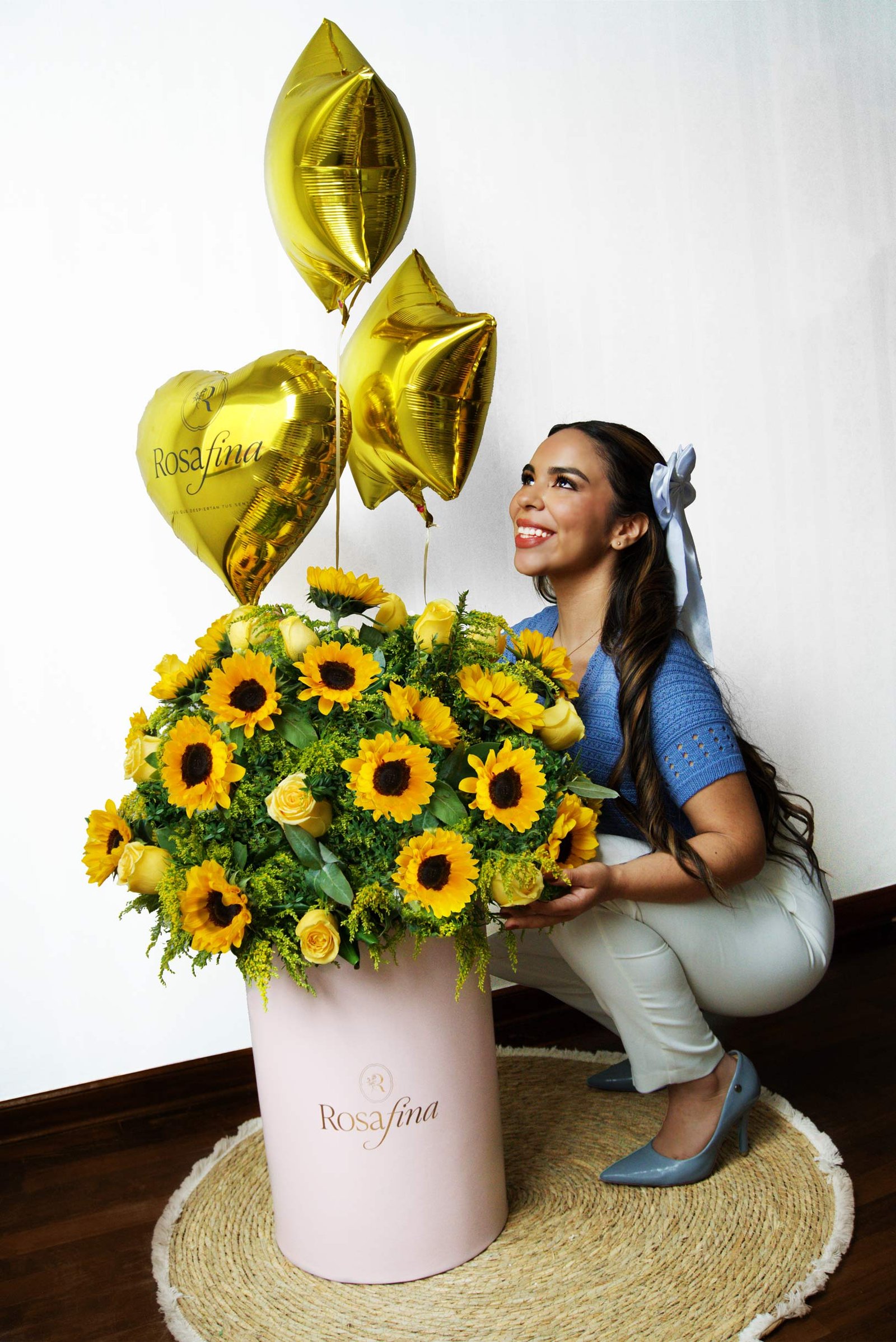 ⟡ Box premium 45cm x 30cm con 100mix de flores premium (girasoles , rosas) + follaje de estación.