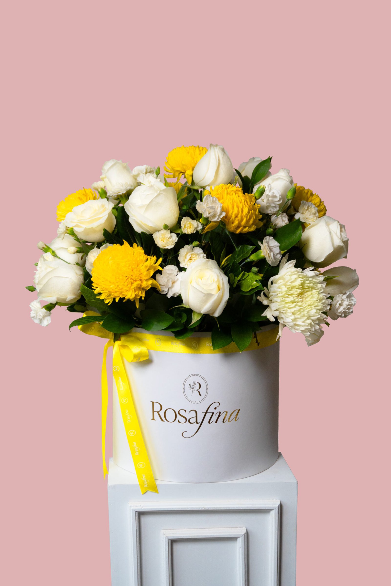 ⟡ Box 30cm + mix de flores ( 24 rosas premium, crisantemos, claveles ) + follaje de estación.