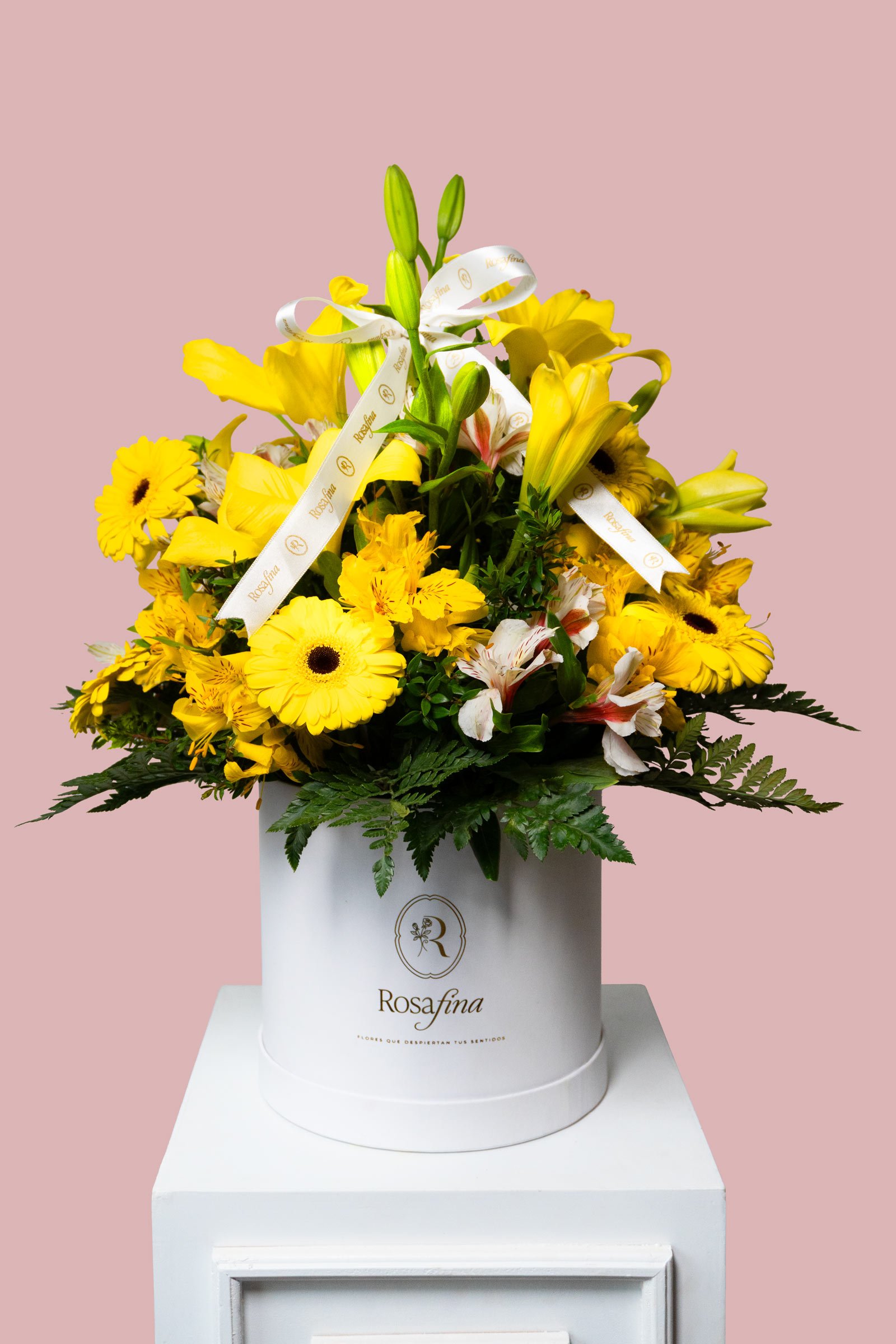 ⟡ Box con mix de flores (gerberas, lilium, astromelias) + follaje de estación.
