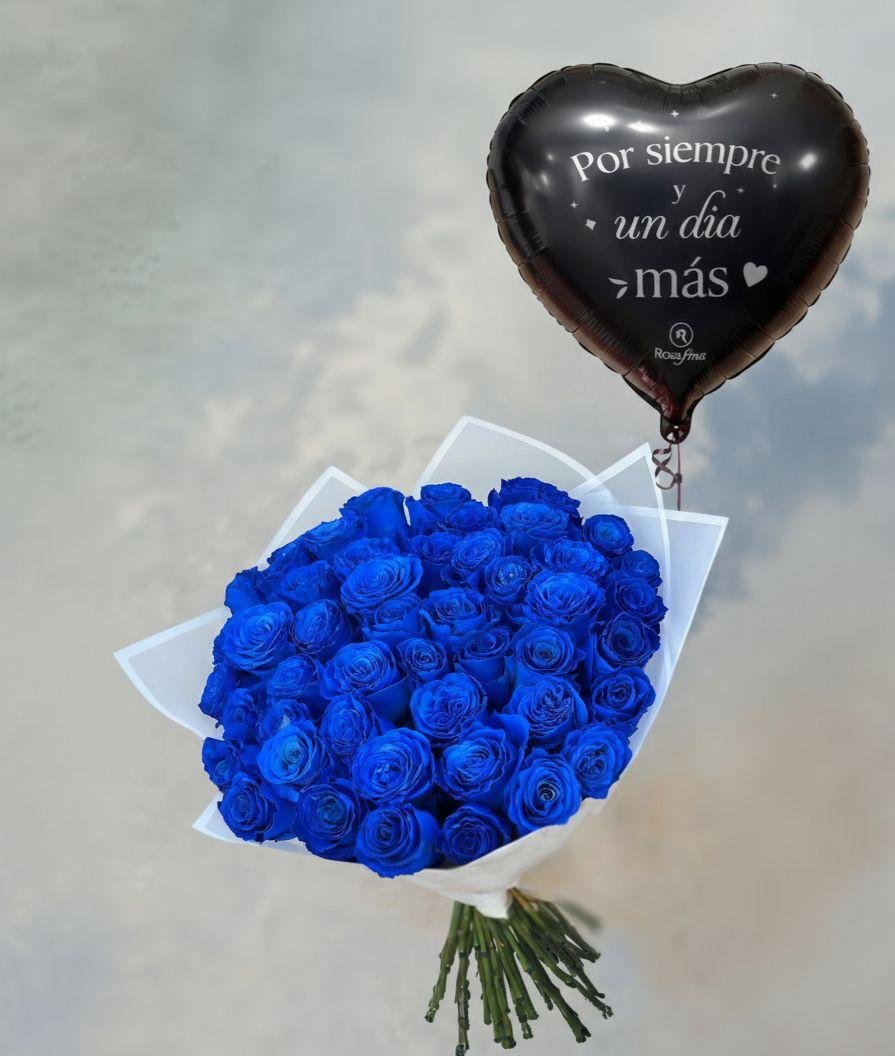 ⟡ Composición de 36 rosas azules + globo metálico con frase exclusiva Rosafina