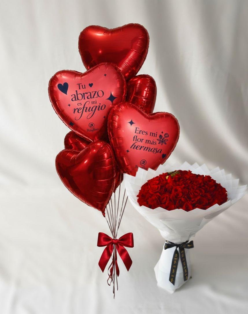 ⟡ Composición de 100 rosas importadas + bouquet de 6 globos con frases exclusivas Rosafina.