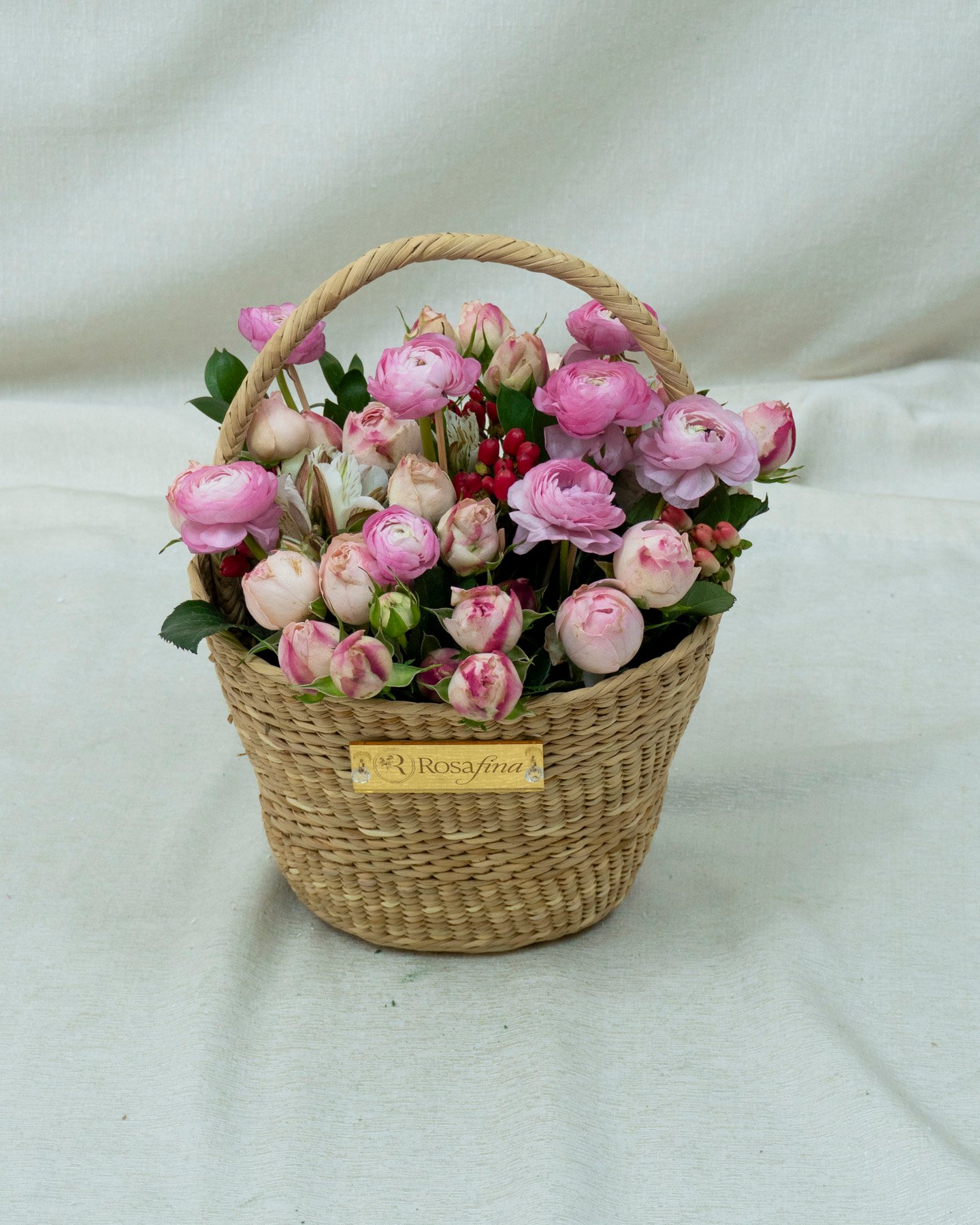 ⟡ Composición floral en canasta de rosas inglesas y renunculus + acentos florales